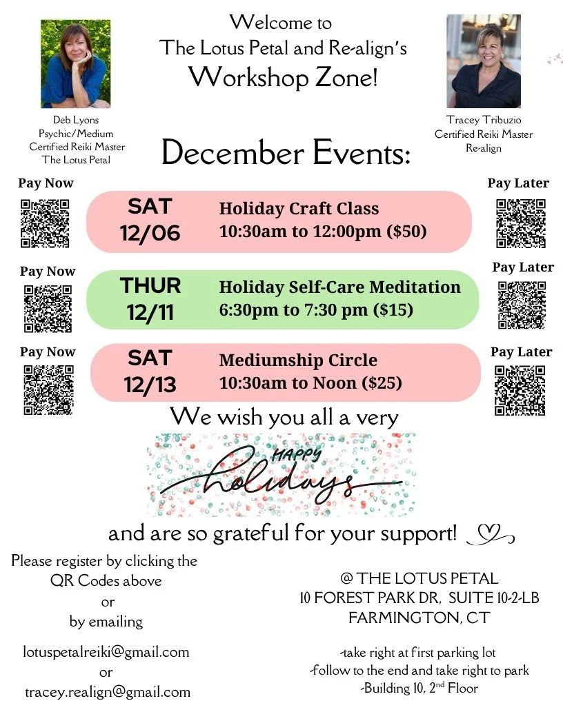 Sessions are available in my private studio, and I also collaborate with others to host group events, classes, workshops, and pop-ups featuring guest speakers and holistic practitioners.