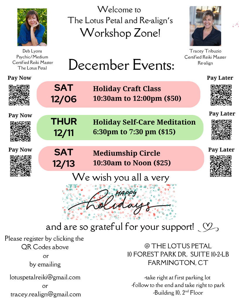 Sessions are available in my private studio, and I also collaborate with others to host group events, classes, workshops, and pop-ups featuring guest speakers and holistic practitioners.